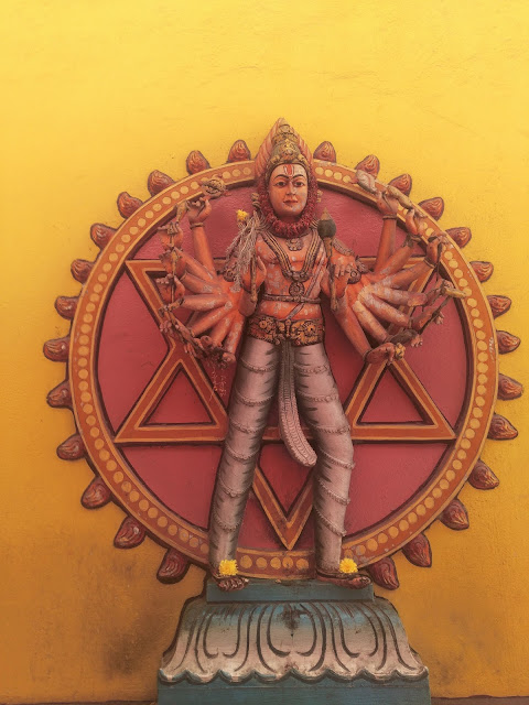 ஷடகோண பின்னணியில் பதினாறு கரங்களுடன் கோவில்களில் இவர் காட்சியளிப்பதை காணலாம்.